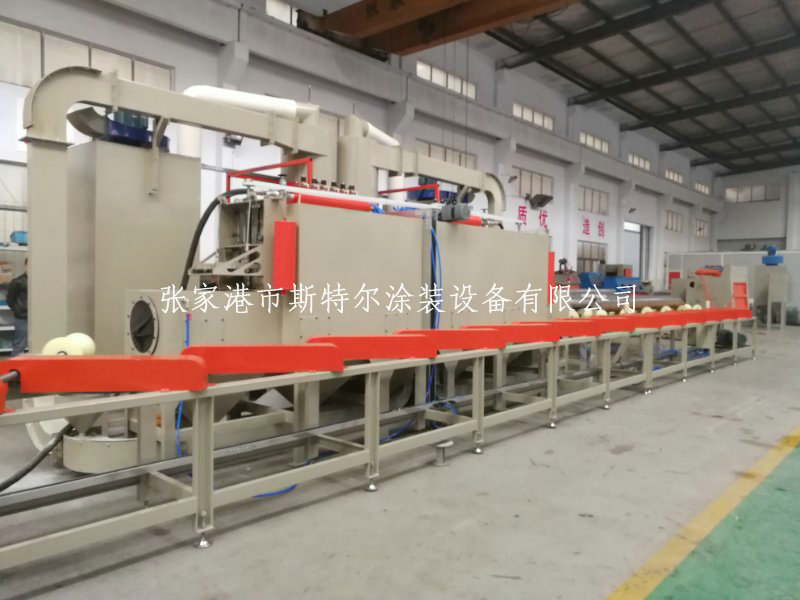 噴砂機,由噴砂室、上料架、旋轉輸送、噴槍移動和高度調節、下料架、砂塵分離、儲料箱、除塵器及控制等幾部分組成,加工過程中管道一邊移動一邊旋轉,在噴砂區域設置移動噴砂槍32套,即可實現管道外壁的全覆蓋。整套設備采用全自動控制。為延長設備的維護周期,在主機內部斜斗處,安裝10mm耐磨板;噴砂設備采用全自動回收裝置,提升機快速回收沙料裝置,有效的無死角回收,全程監控防跑偏裝置,提高