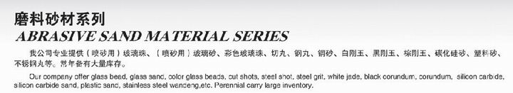 (噴砂(sha)(sha)用)窗有機玻(bo)離(li)珠、(噴砂(sha)(sha)用)窗有機玻(bo)離(li)砂(sha)(sha)、多彩窗有機玻(bo)離(li)珠、切(qie)丸、鋼(gang)丸、鋼(gang)砂(sha)(sha)、白剛玉、黑剛玉、棕(zong)剛玉、氧化硅砂(sha)(sha)、塑膠片砂(sha)(sha)、不(bu)銹鋼(gang)板丸等。長時間(jian)常備(bei)許(xu)多庫(ku)存(cun)管(guan)理。