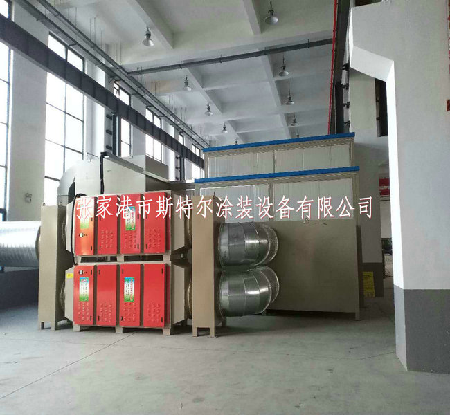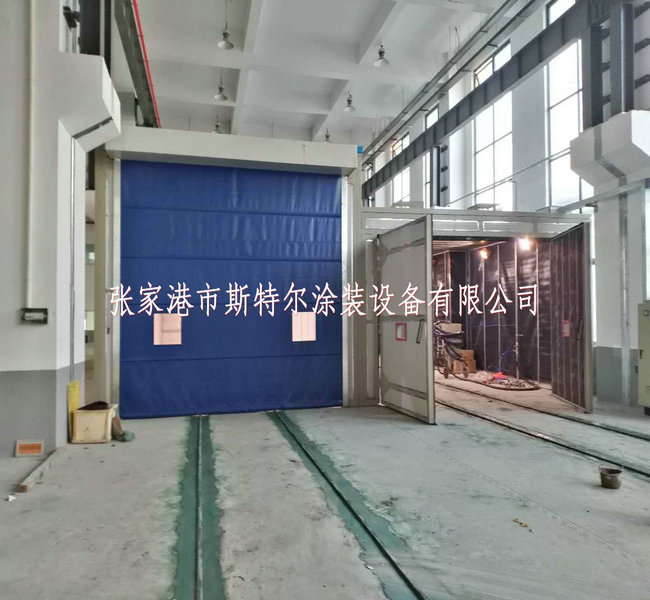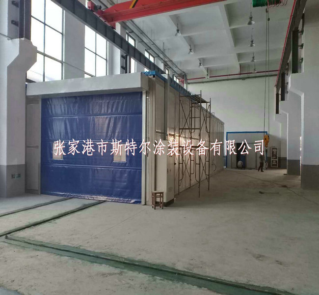 噴鋅房大小16X5.8X3.5m,墻面上用(yong)到10#方管看(kan)做(zuo)骨架,嵌入式75mm巖(yan)棉彩(cai)鋼夾芯板。大門(men)口為電動(dong)四輪(lun)升(sheng)級式,未端使用(yong)顆粒物活性(xing)炭過濾墻。