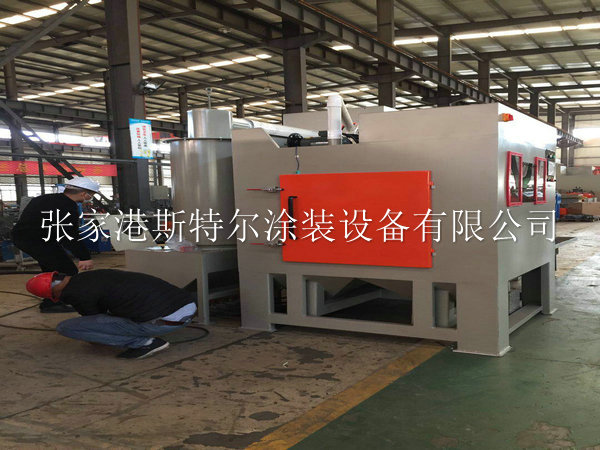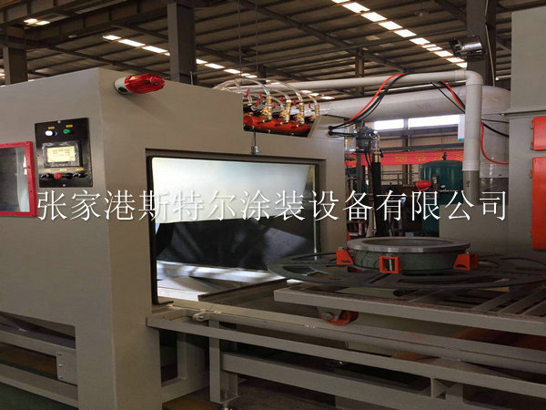 該設備由砂料回收系統、噴砂系統、除塵系統、工件旋轉及控制系統等組成。本設備的工件旋轉部分采用轉盤旋轉,輪轂在轉盤上旋轉的同時輪轂上方還布置8把擺動普壓噴槍,機倉內設有除塵及回砂系統,當工件通過噴砂后,可將工件清理干凈,從機倉出來前將用壓縮空氣將工件表面的粉塵吹凈,并吸到除塵箱里。我公司在設計輪胎模具噴砂機的相對經驗還是比較豐富,在噴砂機的設計理念上使用了新的技術和方案,保證在使用加工時候達到低能耗,低故障,高環保等要素,實現傻瓜式操作噴砂機加工模具。在工件進入工作倉的同時,可以實現手工操作和自動化操作,在噴砂機磨料撞擊工件產生的粉塵無任何泄露,保證操作工人的身心健康,噴砂機在使用中工作倉會產生粉塵等雜物我們通過旋風分離設備直接過濾和清除掉,防止二次污染等。整體噴砂設備機械配備了智能化控制系統,預警報警燈功能,在工件進入工作倉實現預警,在噴砂加工結束實現報警取件等措施,在使用中發揮設備的較大效率。